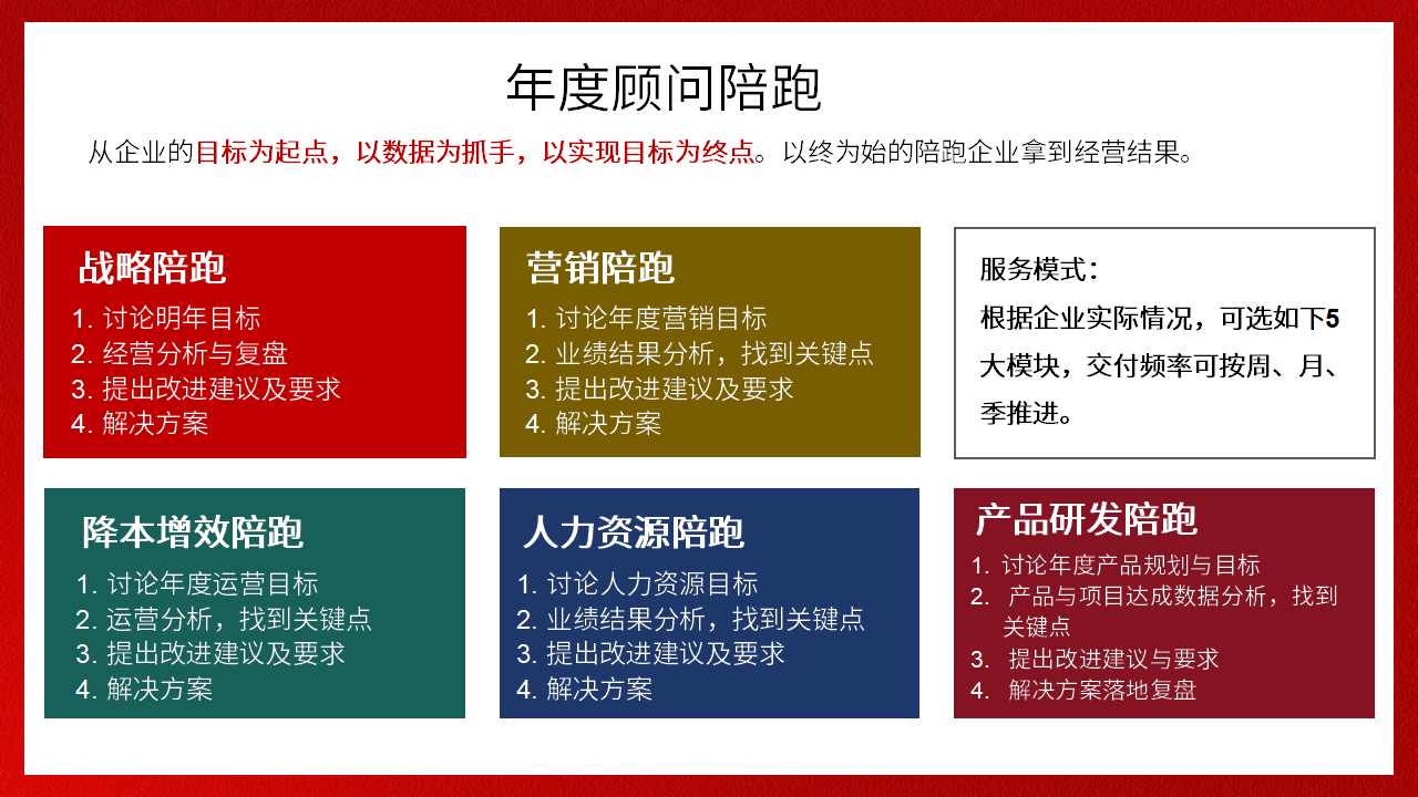 破解經(jīng)營(yíng)困惑,解決關(guān)鍵卡點(diǎn),以目標(biāo)為起點(diǎn),陪跑企業(yè)拿到更好經(jīng)營(yíng)結(jié)果