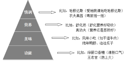 如上圖所示,這可以說是馬斯洛需求層次理論在食品行業(yè)中深度的實(shí)踐版。從消費(fèi)者需求層次層面來劃分的話,食品的價(jià)值屬性由低到高可歸結(jié)為四類:功能、美味、營(yíng)養(yǎng)和情調(diào)。