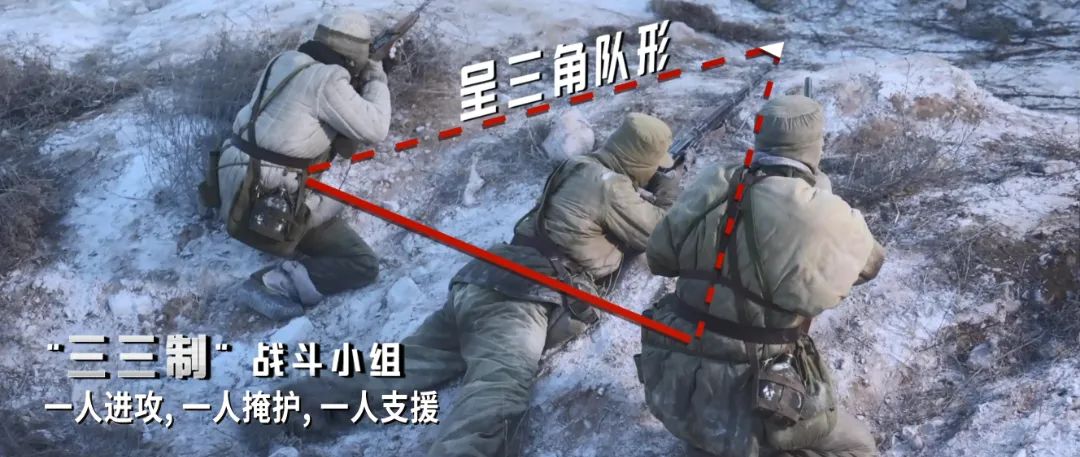 抗日戰(zhàn)爭時期,我軍由于裝備上的匱乏,不如日方裝備精良,作戰(zhàn)時,不得不常以密集隊形沖擊日軍的堅固陣地。按照當時的布置,三人為一個戰(zhàn)斗小組。在三人作戰(zhàn)小組中,這三個戰(zhàn)士分工十分明確,一個是進攻,一個進行掩護,一個則在進行支援,而三個戰(zhàn)斗小組就組成一個戰(zhàn)斗班,三個戰(zhàn)斗班則組成一個戰(zhàn)斗群這種沖鋒方式。這樣的隊形可以把落后的裝備,形成大的戰(zhàn)斗力,同時營造一種四面八方密集沖鋒的態(tài)勢,給敵軍造成巨大的心理壓力。