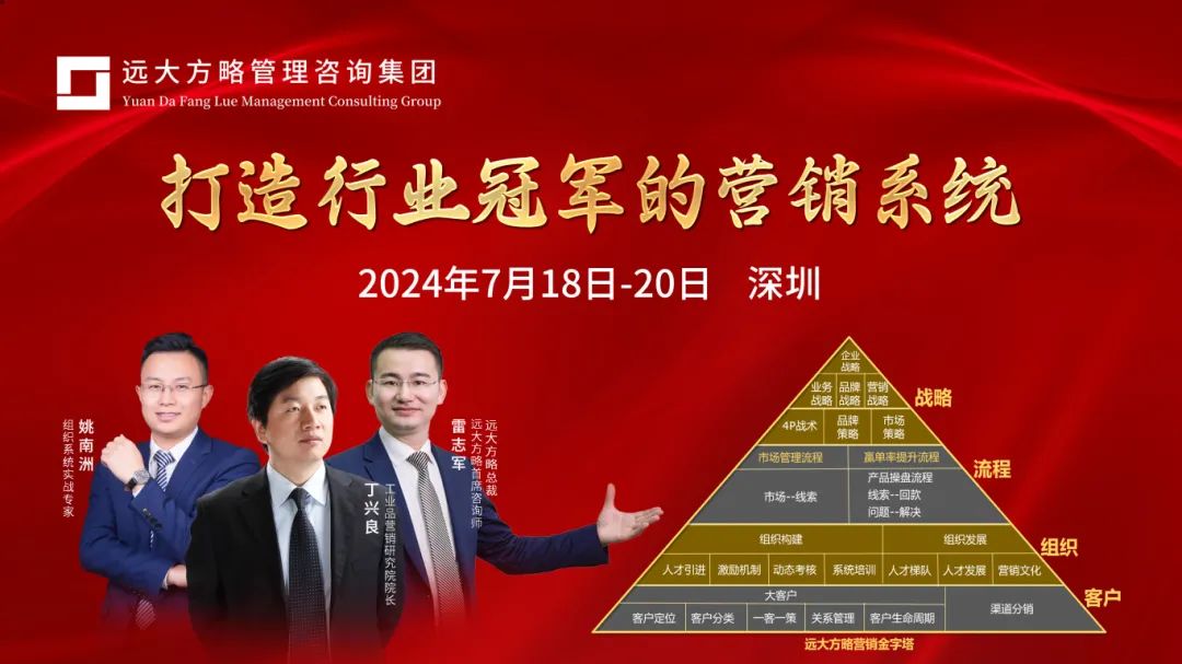 7月18日-20日,遠大方略《打造行業(yè)冠軍的營銷系統(tǒng)》,三大實戰(zhàn)導(dǎo)師聯(lián)袂授課,深度剖析成功咨詢實戰(zhàn)案例,學(xué)會一套營銷系統(tǒng)打造的系統(tǒng)方法,實現(xiàn)可持續(xù)增長。