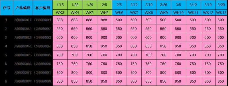 不同企業(yè)選擇也不盡相同,客戶需求穩(wěn)定一般所采用的是前兩者;一份Shipping plan報表,一般前面幾周是正式PO訂單模式,后面數(shù)周是FORECAST需求模式;以下是簡易版SHIPPING PLAN,如截圖2: