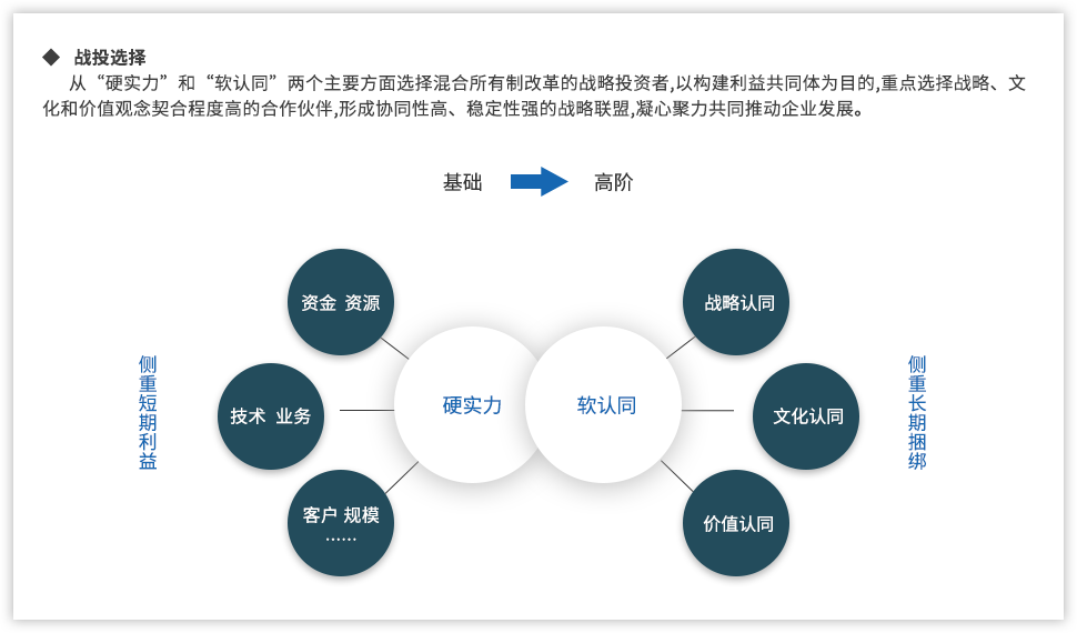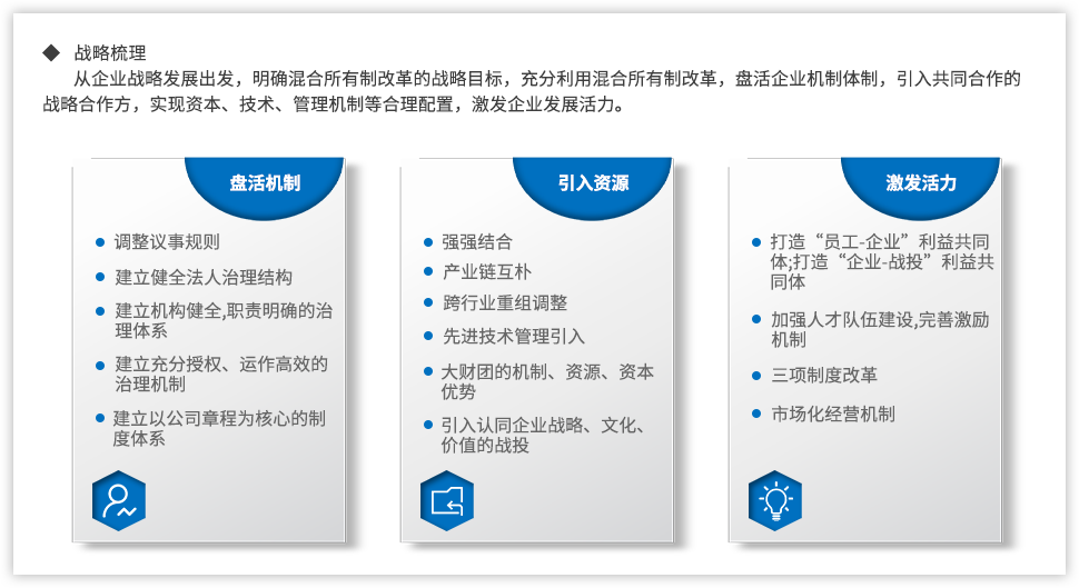 黨的十九大報(bào)告指出:“要深化國有企業(yè)改革,發(fā)展混合所有制經(jīng)濟(jì),培育具有全球競爭力的世界一流企業(yè)”;當(dāng)前,隨著國企改革“雙百行動(dòng)”、區(qū)域性國資國企綜合改革試驗(yàn)、“科改示范行動(dòng)”、第三批以及第四批混改試點(diǎn)的實(shí)施,國企改革由點(diǎn)向面梯次鋪開、范圍逐步擴(kuò)大,并呈現(xiàn)明顯加速,國有企業(yè)改革進(jìn)入“深水區(qū)”。追本溯源,國企改革到底怎么改,回到國有企業(yè)改革的初衷我們認(rèn)為,國有企業(yè)改革是以混和所有制為手段,在堅(jiān)持黨的領(lǐng)導(dǎo)下建立現(xiàn)代企業(yè)制度,優(yōu)化管理關(guān)系,創(chuàng)新管理機(jī)制,激發(fā)員工活力,從而最終實(shí)現(xiàn)國有企業(yè)的持續(xù)發(fā)展?;旄穆鋵?shí)到具體實(shí)踐中,便處處是難點(diǎn)。遠(yuǎn)大方略認(rèn)為,混改的重點(diǎn)已經(jīng)從以“政策研究+方案制定”為主轉(zhuǎn)變到以化解落地過程中的實(shí)際痛點(diǎn)為主,從剖析“為什么混、和誰混、怎么混”轉(zhuǎn)變?yōu)槁鋵?shí)治理結(jié)構(gòu)、戰(zhàn)略協(xié)同以及激勵(lì)機(jī)制等深層次問題。