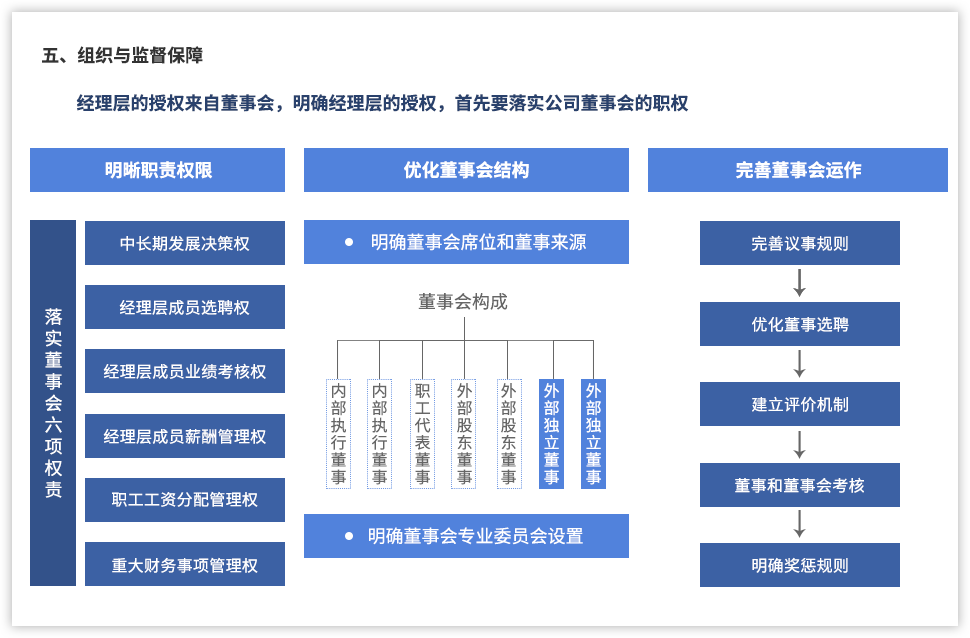 職業(yè)經(jīng)理人改革的核心目的是自上而下地為企業(yè)建立市場化的經(jīng)營機制和激勵約束機制,推動國有企業(yè)市場主體地位的落實,增強、釋放企業(yè)發(fā)展活力和潛力。遠大方略認為,職業(yè)經(jīng)理人改革是一個體系工程,其實施需要以公司治理結(jié)構完善為先決條件,以人才發(fā)展體制機制改革為制度基礎,以契約化管理和有效的考核、激勵、約束機制作為保障,涵蓋戰(zhàn)略引導、治理機制、崗位價值、薪酬策略、激勵前設、契約管理等多個方面。