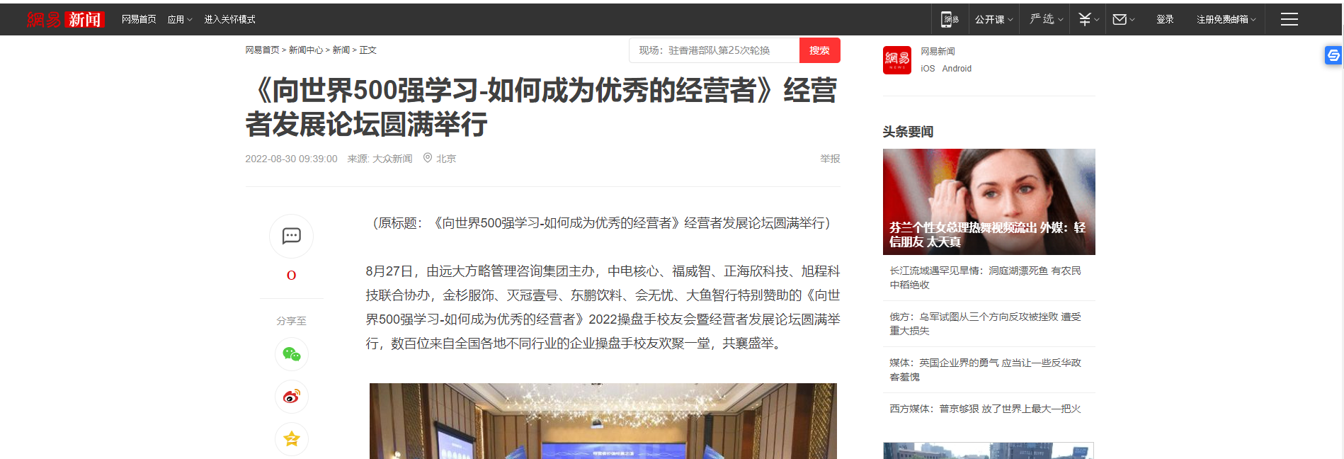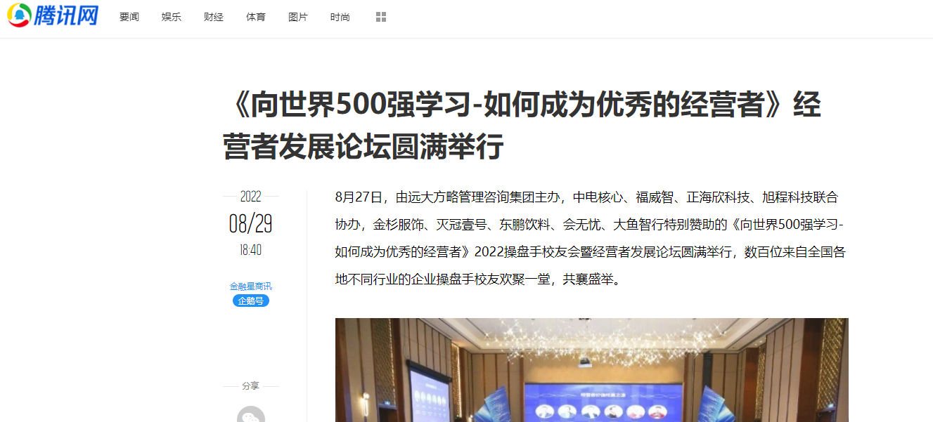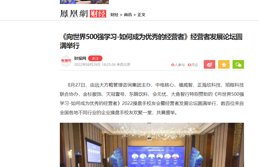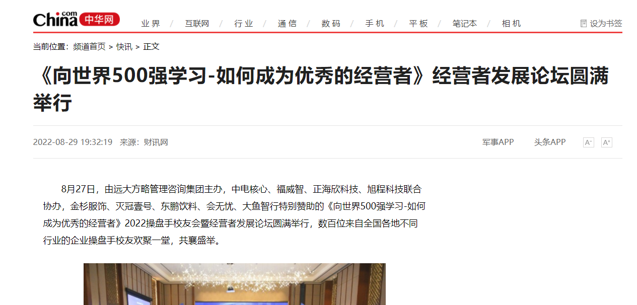 8月27日,由遠(yuǎn)大方略管理咨詢集團(tuán)主辦,中電核心、福威智、正海欣科技、旭程科技聯(lián)合協(xié)辦,金杉服飾、滅冠壹號(hào)、東鵬飲料、會(huì)無(wú)憂、大魚智行特別贊助的《向世界500強(qiáng)學(xué)習(xí)-如何成為優(yōu)秀的經(jīng)營(yíng)者》2022操盤手校友會(huì)暨經(jīng)營(yíng)者發(fā)展論壇圓滿舉行,數(shù)百位來(lái)自全國(guó)各地不同行業(yè)的企業(yè)操盤手校友歡聚一堂,共襄盛舉。