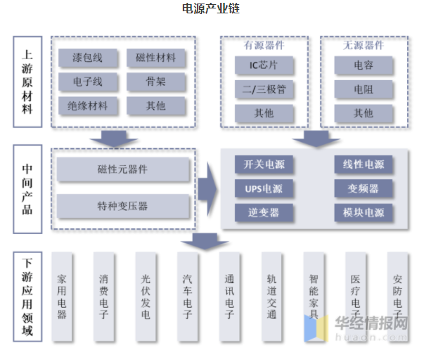 電源產(chǎn)業(yè)鏈主要包括上游原材料、中游中間產(chǎn)品及電源制造、下游應(yīng)用領(lǐng)域。原材料供應(yīng)商主要為電源制造商提供控制芯片、功率器件、變壓器、PCB板等電子器件;中游電源制造商進行電源產(chǎn)品研發(fā)和生產(chǎn),并通過各種營銷渠道對產(chǎn)品進行銷售和提供相應(yīng)的售后服務(wù),并負責(zé)根據(jù)行業(yè)用戶對相關(guān)產(chǎn)品的需求,采購相應(yīng)型號、規(guī)格的電源產(chǎn)品,應(yīng)用到相應(yīng)的電子設(shè)備中,并提供設(shè)備的技術(shù)支持和售后服務(wù);下游應(yīng)用領(lǐng)域廣泛,主要包括新能源汽車,通信電源,以及軍工等領(lǐng)域。