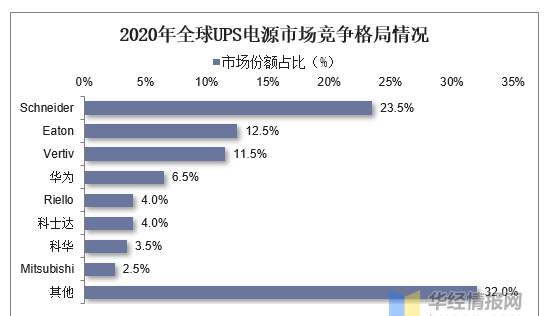 從全球市場競爭格局來看,根據(jù)Omida的統(tǒng)計,2020年全球UPS電源行業(yè)CR3市占率達到49%,行業(yè)集中度較高。