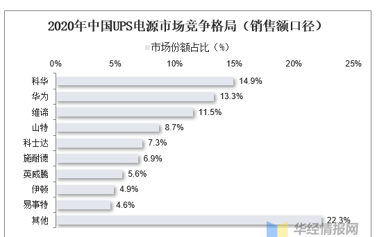 就國內(nèi)市場而言,根據(jù)CCW Research數(shù)據(jù),國內(nèi)UPS廠商已超過2000多家,但規(guī)模較大的企業(yè)數(shù)量有限。2020年銷售額過億的UPS廠商不足12家,市場份額主要被科華數(shù)據(jù)、華為、維諦、山特等企業(yè)占據(jù)。2020年,科華市占率為14.9%,位列國內(nèi)UPS市場第一名;華為市場份額占13.3%,排名提升至市場第二;維諦以11.5%的市場份額位居第三。