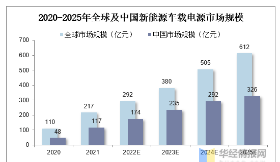 車載電源主要包括車載充電機OBC和車載DC-DC轉(zhuǎn)換器,其中OBC的作用是將市電交流輸入轉(zhuǎn)換為電動汽車動力電池所需的直流,為動力電池充電;車載DC-DC轉(zhuǎn)換器則是將電動汽車動力電池的高壓轉(zhuǎn)換為12V或24V低壓,為車上低壓蓄電池等設(shè)備供電。從新能源車載電源市場規(guī)模來看,預(yù)計至2025年全球新能源車電控市場規(guī)模將達1114億元,2020-2025年CAGR為41%,其中MCU達783億元,VCU達70億元,BMS達261億元;全球車載電源市場規(guī)模達612億元,2020~2025年CAGR達41%。至2025年中國新能源車電控市場規(guī)模將達594億元,2020~2025年CAGR達47%;中國車載電源市場規(guī)模達326億元,2020-2025年CAGR達47%。