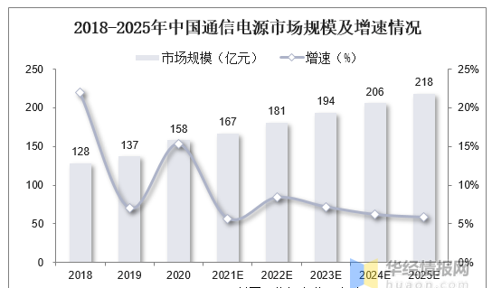 通信設(shè)備領(lǐng)域是電源的重要應(yīng)用領(lǐng)域之一。通信電源為基站通信設(shè)備、光通信網(wǎng)絡(luò)設(shè)備、寬帶通信設(shè)備、程控和網(wǎng)絡(luò)交換機、環(huán)境及監(jiān)控設(shè)備等提供電源保障。從通信領(lǐng)域電源市場規(guī)模來看,根據(jù)中國電源學(xué)會統(tǒng)計,2020年我國通信電源市場規(guī)模達150億元。隨著全球5G建設(shè)的加速推進,2025年我國電源市場規(guī)模有望達到218億元。