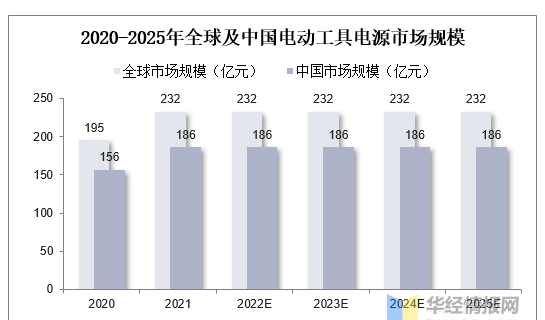 電動工具電源市場保持穩(wěn)定,具體來看,預(yù)計至2025年全球電動工具市場規(guī)模將達232億元,2020-2025年CAGR達3.51%,中國電動工具市場規(guī)模將達186億元,2020-2025年CAGR達3.51%。
