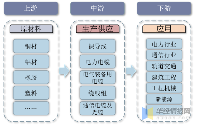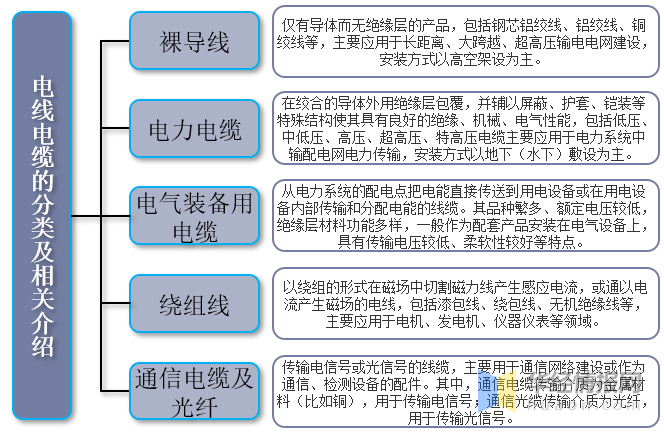 電線(xiàn)電纜行業(yè)產(chǎn)業(yè)鏈上游主要為銅材、鋁材、橡膠、塑料等原材料;中游為電線(xiàn)電纜生產(chǎn)供應(yīng)環(huán)節(jié),主要產(chǎn)品包括裸導(dǎo)線(xiàn)、電力電纜、電氣裝備用電纜、繞線(xiàn)組、通信電纜及光纖;下游廣泛應(yīng)用于電力、通信、軌道交通、建筑工程、工程機(jī)械、新能源等領(lǐng)域。