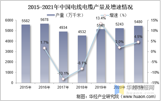 隨著近年來(lái)我國(guó)城市化、智能電網(wǎng)建設(shè)等進(jìn)程的不斷加快,推動(dòng)我國(guó)電線(xiàn)電纜行業(yè)快速發(fā)展。電線(xiàn)電纜產(chǎn)量也隨之逐漸增長(zhǎng)。據(jù)資料顯示,2021年我國(guó)電線(xiàn)電纜產(chǎn)量為5480萬(wàn)千米,同比增長(zhǎng)4.5%。