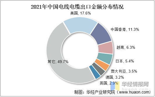 從出口分布情況來(lái)看,2021年我國(guó)電線(xiàn)電纜出口金額中,占比前三的地區(qū)分別為美國(guó)、中國(guó)香港及越南,占比分別為17.6%、11.3%和6.3%。