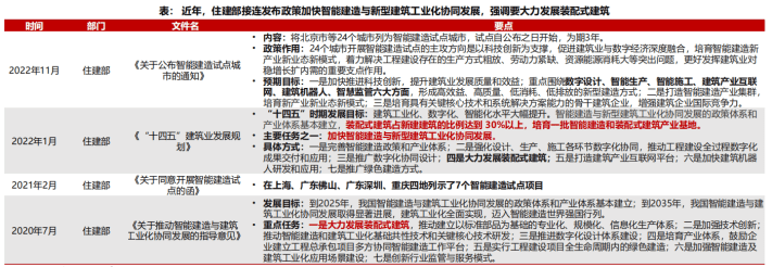 從國家政策上看,2020年7月發(fā)布了《關(guān)于推動(dòng)智能建造與建筑工業(yè)化協(xié)同發(fā)展的指導(dǎo)意見》;2021年2月發(fā)布了《關(guān)于同意開展智能建造試點(diǎn)的函》;2022年1月發(fā)布了《“十四五”建筑業(yè)發(fā)展規(guī)劃》;2022年11月發(fā)布了《關(guān)于公布智能建造試點(diǎn)城市的通知》。住建部正在穩(wěn)步推進(jìn)智能建造,“十四五”建筑業(yè)發(fā)展規(guī)劃提出要求裝配式建筑占新建建筑的比例達(dá)到 30%以上,培育一批智能建造和裝配式建筑產(chǎn)業(yè)基地,裝配式建筑將成為主要的發(fā)力點(diǎn)。在“雙碳”的背景之下,建筑行業(yè)作為“碳排放大戶”,“碳達(dá)峰”任務(wù)的主要抓手,擁有碳減排的空間極大,將會(huì)成為節(jié)能減排的重要節(jié)點(diǎn)。