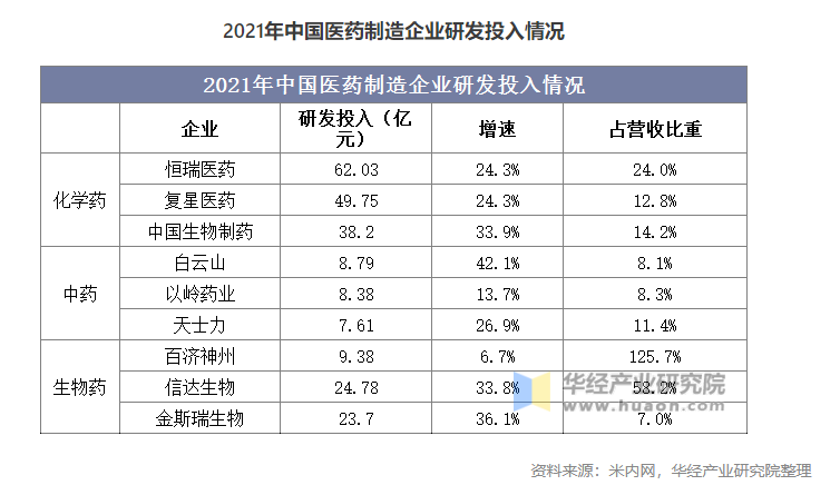 隨著藥品審評(píng)審批制度改革、國家醫(yī)保常態(tài)化調(diào)整等政策改革,“創(chuàng)新”逐漸成為藥企的發(fā)展理念。化學(xué)制藥行業(yè)正在發(fā)生結(jié)構(gòu)性變化,隨著仿制藥出現(xiàn)藥品價(jià)格持續(xù)下降的同時(shí),行業(yè)集中度也有望提升;中醫(yī)藥行業(yè)政策利好不斷,相關(guān)部門從市場準(zhǔn)入、醫(yī)保支付、審評(píng)審批等多個(gè)維度對中醫(yī)藥行業(yè)形成政策支撐,中藥原材料價(jià)格上漲對企業(yè)決策也造成一定的影響;生物藥雖然起步晚于化學(xué)藥,但近年來卻受全球藥企熱捧,成為藥企和投資者競爭的新方向,研發(fā)投入力度較大。