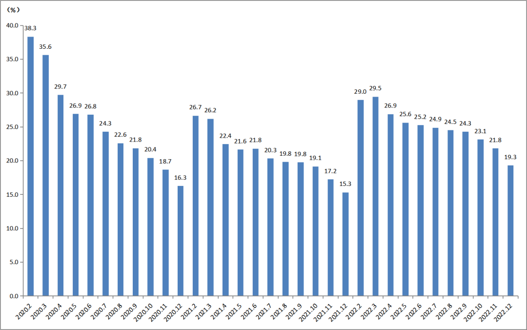 2022年12月底,印刷業(yè)規(guī)模以上企業(yè)的虧損面為19.3%,虧損企業(yè)的虧損總額增長(zhǎng)了28.3%。由圖4可見,自3月以來(lái)虧損面逐步減少,12月有明顯減幅。但與上年相比,虧損面明顯上了一個(gè)臺(tái)階,如12月19.3%的虧損面相比上年同期抬高了4個(gè)百分點(diǎn)。