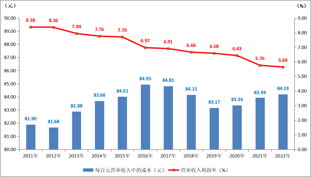 2022年,印刷業(yè)每百元營(yíng)業(yè)收入中的成本為84.19元,低于全部工業(yè)84.72元的平均水平。這一數(shù)字,相比上年的83.94元,有所提升。