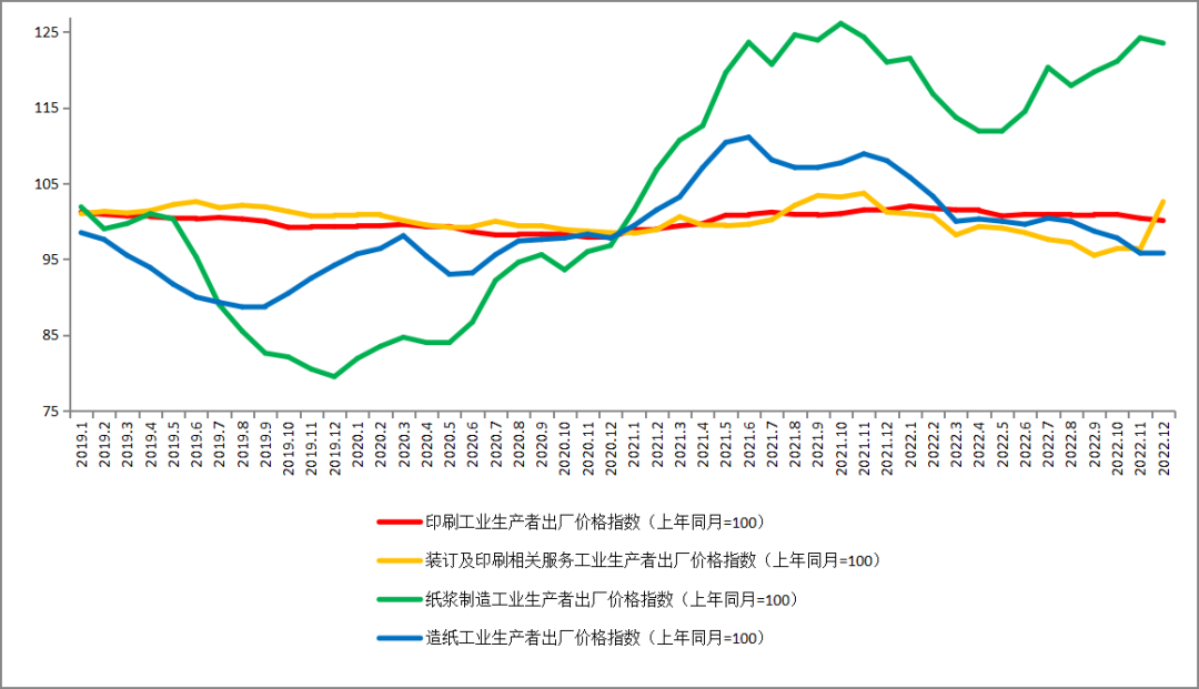相比之下,印刷價(jià)格指數(shù)(紅線)長(zhǎng)期走平;裝訂及印刷相關(guān)服務(wù)價(jià)格指數(shù)(黃線)全年逐步走低,年尾明顯抬升。