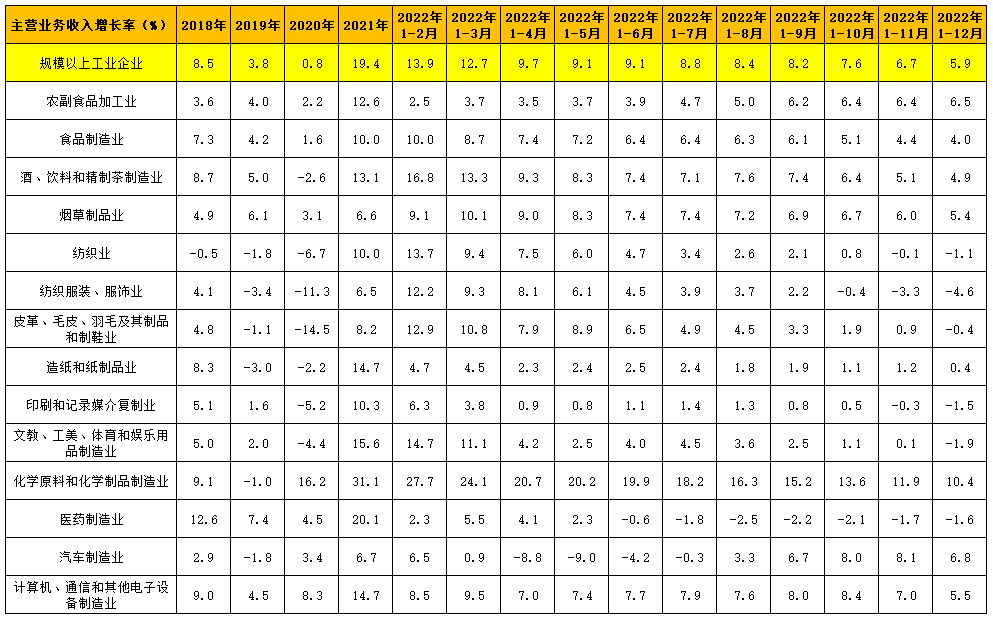 表中顯示,2022年全部工業(yè)主營(yíng)業(yè)務(wù)收入平均增長(zhǎng)為5.9%,各月累計(jì)增速呈逐步下降態(tài)勢(shì)。