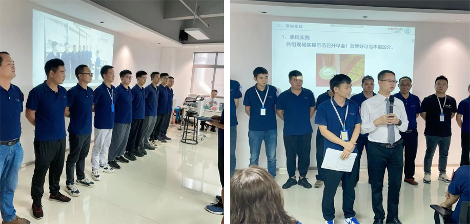 本次項目制系列課主要包括《金牌班組之標準作業(yè)》《金牌班組之動作經濟原則》《金牌班組之高效高質量早會》等十多節(jié)課程,為確保培訓內容的有效落地,此次培訓采用半天培訓+半天輔導的形式,全面提升一線班組長能力,打造金牌班組長。培訓開始之前首先進行了開營儀式,營造濃厚學習氛圍,明確學習目標。