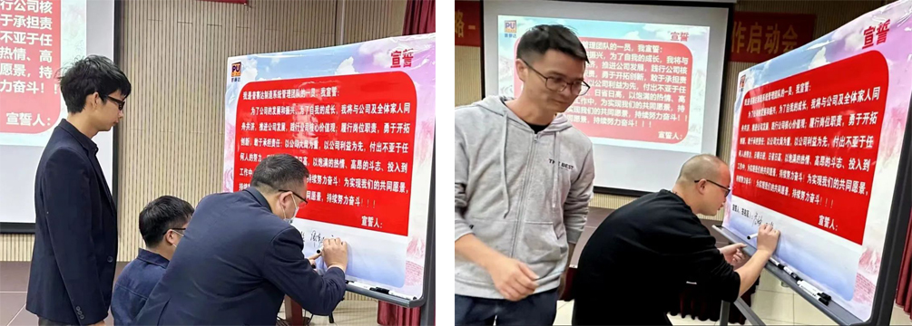為了堅(jiān)定全員參與變革的決心,孫總和大家簽下誓言并宣誓,鼓舞大家持續(xù)提升能力,在助推公司發(fā)展的同時(shí)實(shí)現(xiàn)自我價(jià)值。