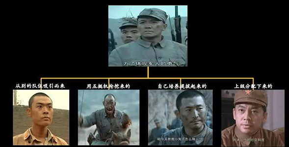 案例:李云龍如何構(gòu)建核心團(tuán)隊(duì)(魏和尚:解救后吸引而來;孫連長:用五挺重機(jī)槍從別的隊(duì)伍挖過來;張營長:自己培養(yǎng)提拔起來,是打出來的;趙政委:上級委派而來。